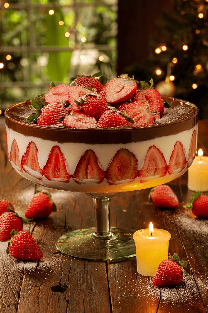 6. Em uma travessa com medidas de aproximadamente 29,7 x 17,8 forrar o fundo com os morangos sem os talos e cobrir com todo o creme.