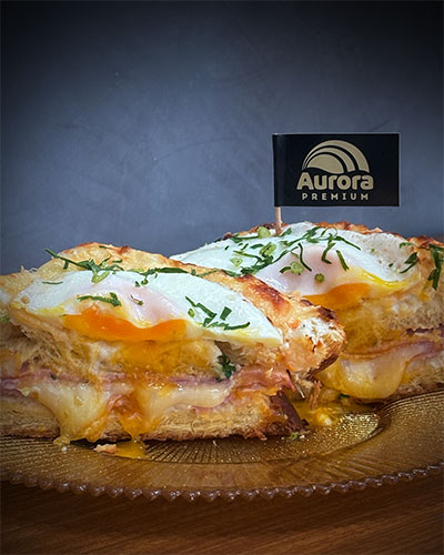4 fatias de pão brioche com espessura de aproximadamente 1,5 cm 4 colheres (sopa) de mostarda Dijon 10 fatias de presunto defumado Aurora Premium 4 fatias de queijo Mussarela Aurora Queijo Parmesão fresco ralado a gosto 1 colher (sopa) de azeite 2 ovos fritos com a gema mole Salsinha fresca picada a gosto