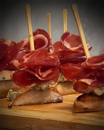 3 unidades de Peras higienizadas 2 colheres (sopa) de manteiga sem sal 1 pacote de Copa fatiada Aurora Premium 1 pedaço de queijo Gorgonzola cortado em cubos pequenos Palitos de aperitivo Mel para finalizar