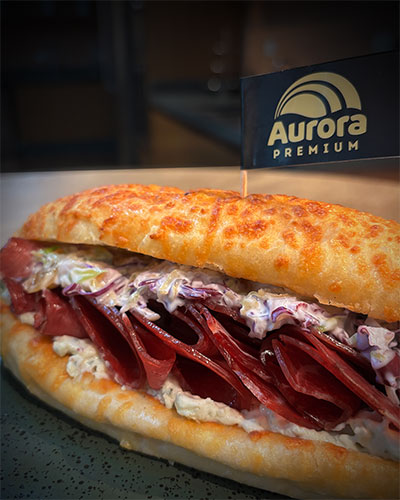 2 unidades de Pão baguete 2 colheres (sopa) de manteiga 2 colheres (sopa) da pasta de queijo 100g de Copa fatiada Aurora Premium 2 colheres (sopa) da salada Coleslaw